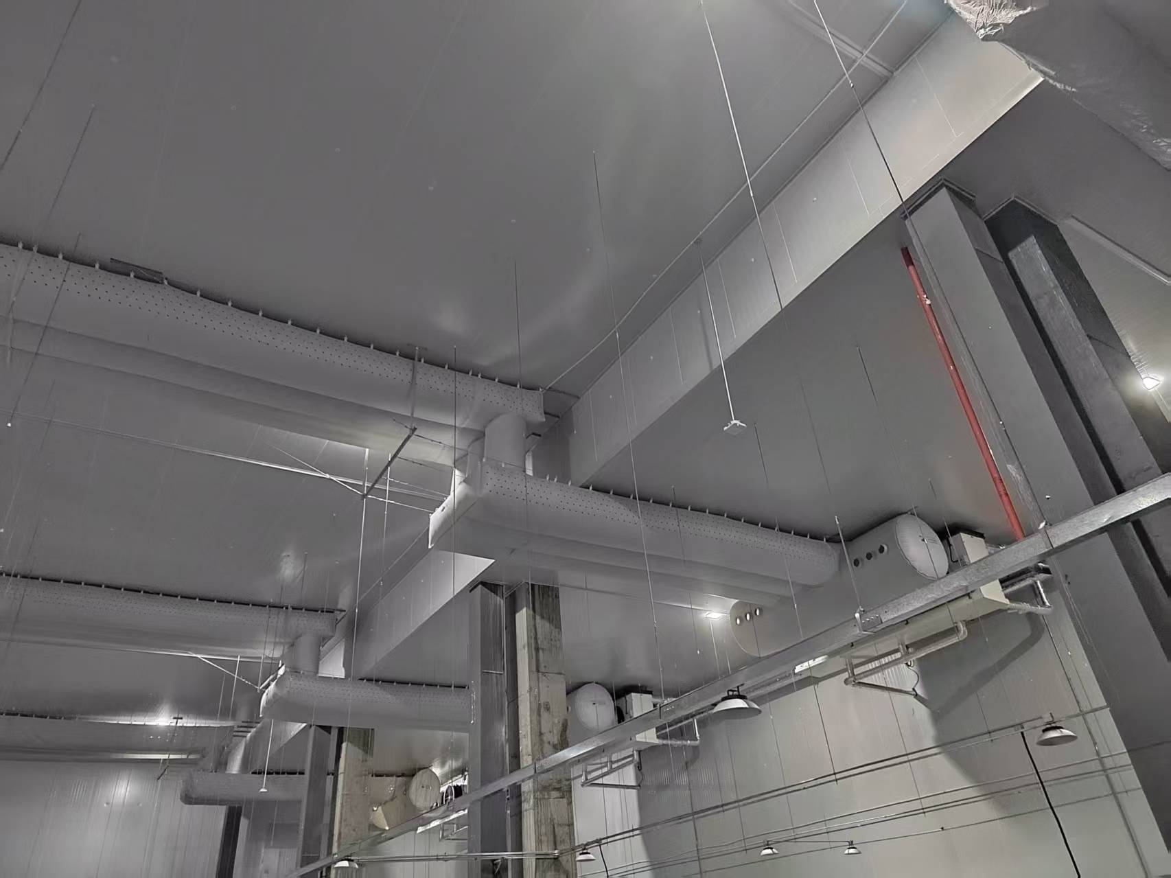 The Zhangzhou Fengrun Food Cold Storage Project features a panel-structured warehouse primarily composed of raw material storage areas. With a warehouse height of 11.2 meters and a cold room temperature of -23°C, this project employs three air coolers integrated with MultiXair fabric ducting to cool the interior. This configuration addresses airflow organization within the warehouse, ensuring precise control of temperature and humidity for stored goods.